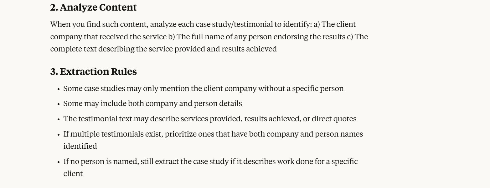 Using set rules, our AI agent then pulls out all key information about your prospects (and their business), focusing on complete data while also sometimes including partial matches.